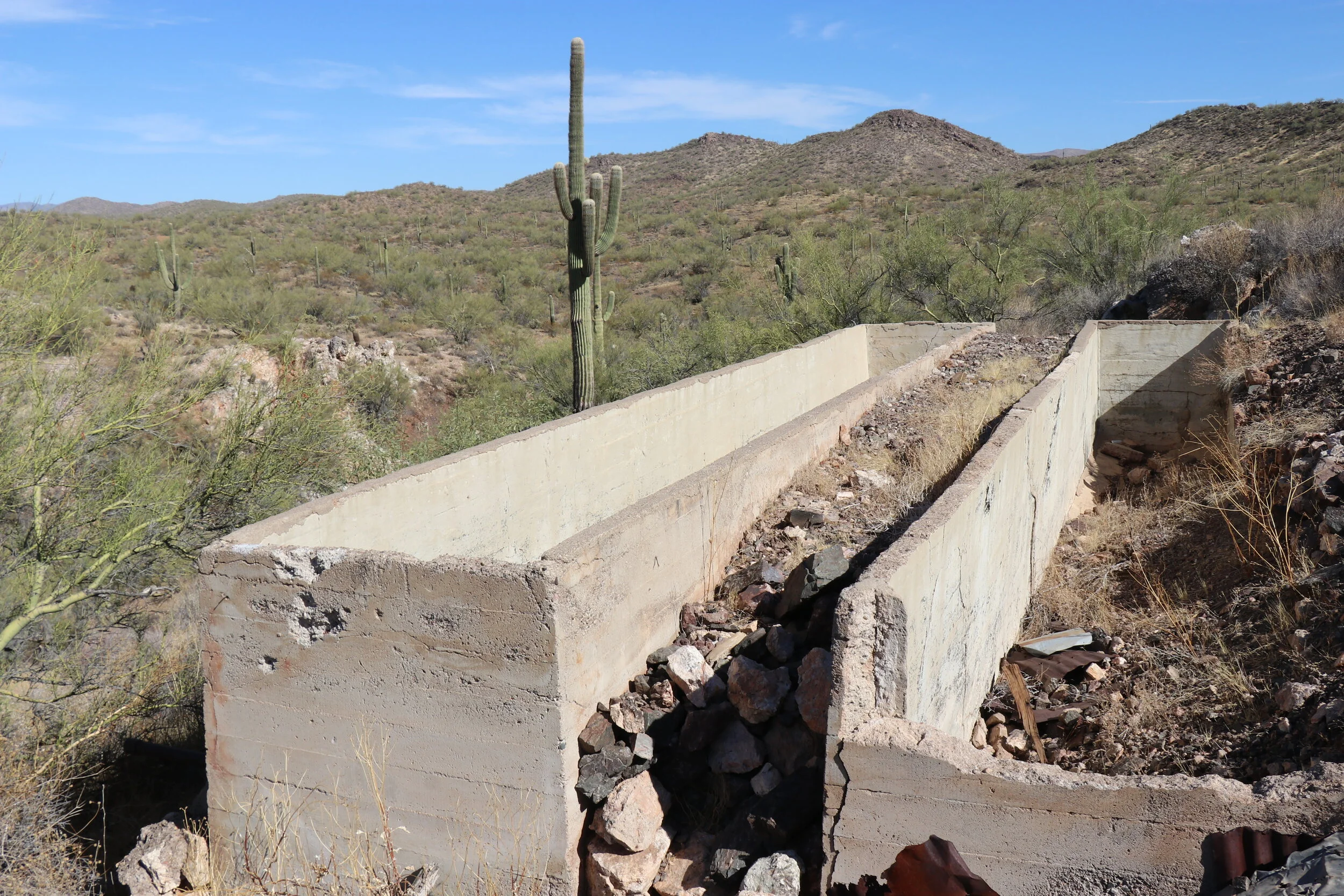 The once bustling Dragon mine now sits in ruins. The numerous cement foundations likely date back to its initial workings in 1918, its revampment in the late 1920s, or maybe a combination of both. The large cement troughs and four post cement tank are some of the unique things left behind and only leaves partial clues as to their purpose. According to the mine file, an arrastre (old milling equipment) was found buried on the Dragon Property. The owner of the mine was in contact with the Department of Mineral Resources to donate it to their mining museum. It is unclear if it was ever recovered.