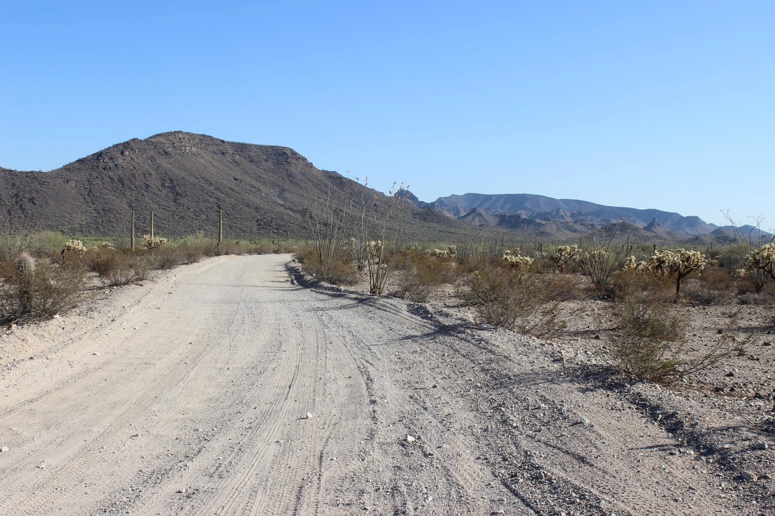 El Camino remains easy as it continues south. At 12.5 miles, you’ll cross a cattle guard and enter into the Organ Pipe Cactus National Monument. There are informational signs and a fee collection box off to the left. Continue down the trail. The road continues west through some scenic mountains before turning back south at 15.5 miles. Off to the right here you’ll notice a humanitarian water station and emergency beacon. El Camino has emergency beacons roughly every 20-30 miles apart. They have a red button on the front and instructions in several languages. If you are in dire need of help, you are supposed to push the button and help will arrive within an hour. Continue south on El Camino.